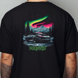 Our black t-shirt from Wroom Shop is the perfect combination of style and comfort.On the back, there is a magnificent graphic featuring a grey car styled as a Porsche against a winter landscape of mountains and a colorful aurora borealis. It's an excellent choice for car enthusiasts and those w..